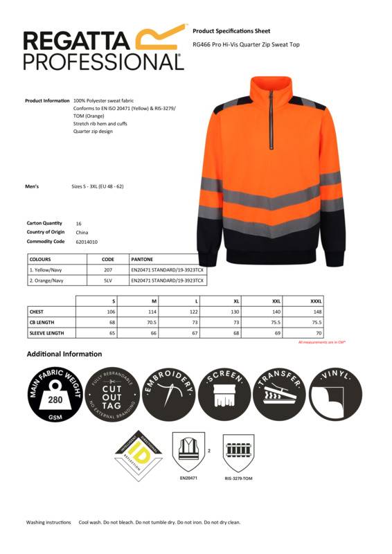 Protective, durable and moisture-resistant, the Pro hi-vis 1/4-zip top is the perfect work baselayer. Featuring polyester sweat fabric, this men’s work sweatshirt will keep you fresh, on the go. Its hi-vis properties ensure you stay seen, whether at the builders’ yard or the warehouse. A 1/4-zip design that brings the style. Conforms to EN ISO 20471 (Yellow) & RIS-3279/TOM (Orange).Protective, durable and moisture-resistant, the Pro hi-vis 1/4-zip top is the perfect work baselayerFeaturing polyester sweat fabric, this men’s work sweatshirt will keep you fresh, on the goIts hi-vis properties ensure you stay seen, whether at the builders’ yard or the warehouseA 1/4-zip design that brings the styleConforms to EN ISO 20471 (Yellow) & RIS-3279/TOM (Orange).Age Group: AdultFabric: 65% Polyester, 35% Cotton fabricGender: MalePlus Size: YesProduct Type: SweatshirtsSize Range: S to 3XLSizing To Fit: S 38″ M 40″ L 42″ XL 44″ 2XL 47″ 3XL 50″Tag: Sewn TagWashing Instructions: Cool wash. Do not bleach. Do not tumble dry. Do not iron. Do not dry clean.Weight (GSM): 195gsm]]>