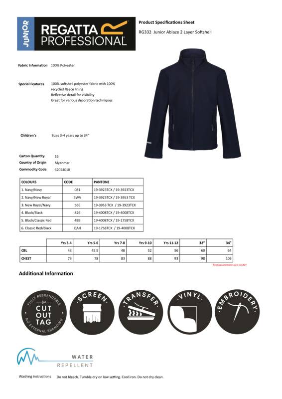 The kids Ablaze two-layer softshell from Regatta Professional is perfect for active little ones. This kids winter jacket is cosy and stretchy, featuring warm-backed softshell fabric – all designed to keep them warm and agile, on the go. Finished with reflective print for enhanced visibility.Cosy, stretchy and reflective, the kids Ablaze two-layer softshell is perfect for mini adventurersFeaturing stretch softshell fabric, this winter jacket will keep them movingFinished with reflective print for safety.Age Group: KidsFabric: 100% PolyesterGender: UnisexPlus Size: NoProduct Type: SoftshellsSize Exclusions: *Size 34″ is VATableSize Range: 3/4yrs – 34″Sizing To Fit: 3/4yrs 104cm 5/6yrs 116cm 7/8yrs 128cm 9/10yrs 140cm 11/12yrs 152cm 32″ 158cm 34″ 164cmTag: Sewn TagWashing Instructions: Machine washable. Do not bleach. Do not tumble dry. Do not iron. Do not dry clean.Weight (GSM): 265gsm]]>