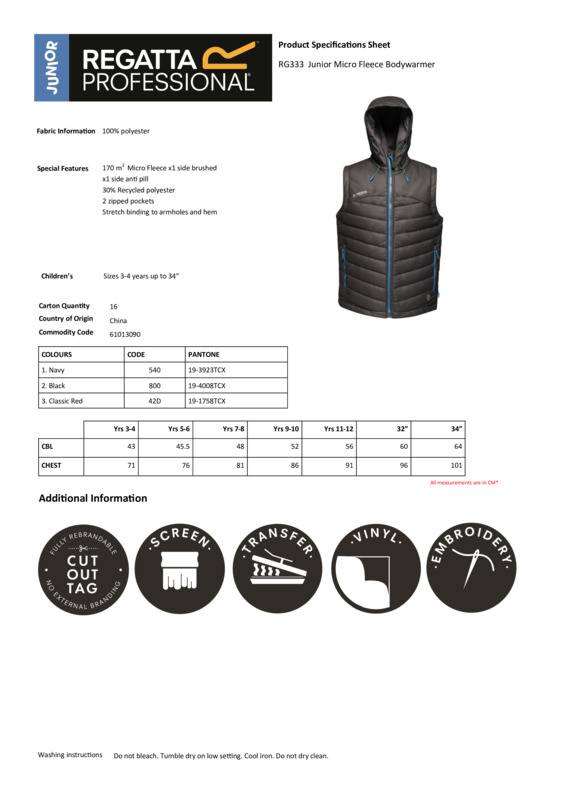The kids microfleece kids bodywarmer from Regatta Professional is the perfect layer for mini adventurers. This gilet is made with comfy and lightweight microfleece, providing warmth without weight. There’s a brushed side for comfort and an anti-pill side for long-lasting wear.Comfy, lightweight and sustainable, the kids microfleece bodywarmer will keep little ones warm and agile on their adventuresFeaturing recycled microfleece, this gilet provides warmth without weightThere’s a brushed side for comfort and an anti-pill side for long-lasting wear.Age Group: KidsFabric: 100% PolyesterGender: UnisexPlus Size: NoProduct Type: FleeceSize Exclusions: *Size 34″ is VATableSize Range: 3/4yrs – 34″Sizing To Fit: 3/4yrs 104cm 5/6yrs 116cm 7/8yrs 128cm 9/10yrs 140cm 11/12yrs 152cm 32″ 158cm 34″ 164cmTag: Sewn TagWashing Instructions: Machine washable. Do not bleach. Do not tumble dry. Do not iron. Do not dry clean.Weight (GSM): 170gsm]]>