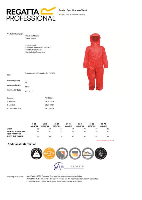 Messy play has never been so stress free. The kids rain suit comes in a convenient one piece for the ultimate protection from mud, wind and rain. The kids one piece is crafted from a waterproof and breathable fabric. It's windproof too. The lightweight construction ensures play is never restricted.Waterproof and breathable Isolite lightweight polyester fabricWindproof fabricTaped seamsIntegral hoodReflective trim to front and backPart-elasticated waistElasticated cuffs and hem.Age Group: KidsFabric: 100% PolyesterGender: UnisexPlus Size: NoProduct Type: Rain SuitsSize Range: 6/12mths to 5/6yrsSizing To Fit: 6/12mths 12/18mths 18/24mths 2/3yrs 3/4yrs 4/5yrs 5/6yrsTag: Sewn TagWashing Instructions: Cool machine wash with Regatta Isotex cleaner or pure soap. Do not use detergents or fabricconditioners. Fasten zips and hook and loop fastening during washing and drying. Rinse very well. Light tumble dryonly. Use cool iron on outer side. Reproof outer fabric regularly with water repellent spray. Fabricmay be damaged by solvents, alcohols, and insecticides. Store away from direct sunlight.Weight (GSM): 80gsm]]>