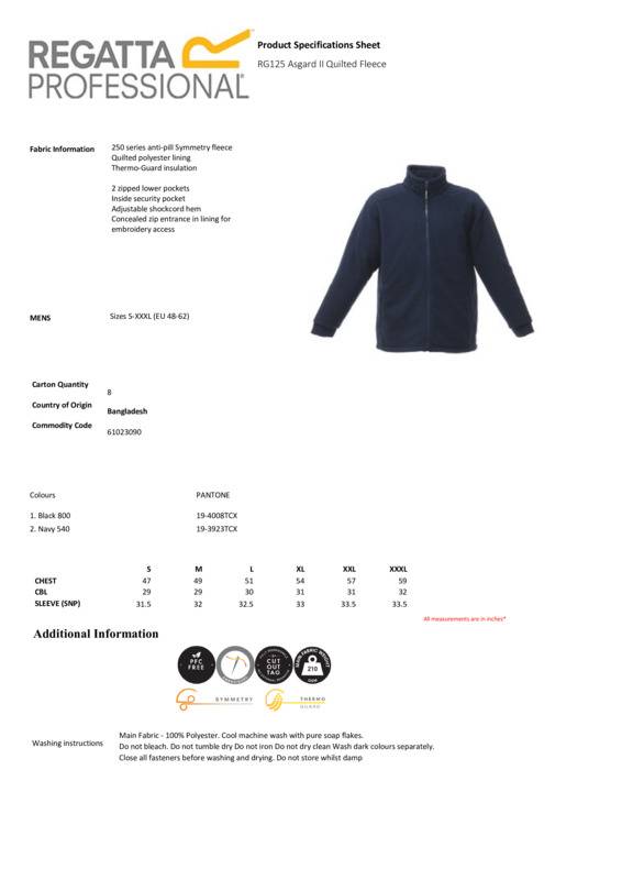 Stay super toasty in the Asgard II. The men's fleece features a quilted polyester lining, providing that extra warming layer. The super-soft fleece feels great against your skin. It comes with two zipped pockets, perfect for your valuables. It's quick-drying too, drawing moisture away from the skin to keep you comfortable.250 series anti pill symmetry fleece with quilted Polyamide lining and Thermoguard insulation2 zipped lower pockets and inside map pocketAdjustable shockcord hem and concealed zip entrance in lining for embroidery access.Age Group: AdultFabric: 210 series anti-pill symmetry fleeceGender: MalePlus Size: YesProduct Type: FleeceSize Range: S to 3XLSizing To Fit: S 37/38″ M 39/40″ L 41/42″ XL 43/44″ 2XL 46/48″ 3XL 49/51″Tag: Sewn TagWashing Instructions: Cool machine wash with pure soap flakes. Do not bleach. Do not tumble dry Do not iron Do not dry clean Do not iron on print Close all fasteners before washing and drying. Fabric may be damaged by solvents, alcohols, and insecticides.Weight (GSM): 210gsm]]>