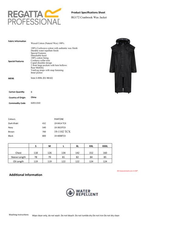 The Cranbrook caped wax riding jacket from Regatta Professional. Comfortable, breathable and with a country-casual vibe – it gets the job done in style. Featuring 100% Coolweave cotton and a soft lining for comfort, as well as hem bellows and leg straps, it’s ideal for horseriding.100% Coolweave cotton with authentic wax finish100% cotton check lining and detachable hood2 front large pockets with hem bellows and leg straps with snap fasteningCaped design with rear mobility ventReach certifiedEthical Trading Initiative certified.Accreditations: Ethical Trading Initiative|ReachAge Group: AdultFabric: 100% Waxed cotton (natural wax)Gender: MalePlus Size: YesProduct Type: JacketsSize Range: S to 3XLSizing To Fit: S 38″ M 40″ L 42″ XL 44″ 2XL 47″ 3XL 50″Tag: Sewn TagWashing Instructions: Wipe clean only. Do not wash. Do not bleach. Do not tumble dry. Do not iron. Do not dry-clean.Weight (GSM): 200 gsm]]>