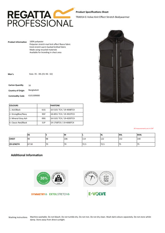 The E-Volve unisex knit-effect stretch bodywarmer, from Regatta Professional, is the ideal go-to work layer. This work gilet is made with Extol stretch fabric, helping you to get on with the job without restriction. The warm-backed, knitted finish provides a cosy fit, while block colour panels present a sporty look. Add your personal branding to the chest area. REACH, GRS certified fabric and ETI compliant factory certified.The E-Volve unisex knit-effect stretch bodywarmer, from Regatta Professional, is the ideal go-to work layerThis work gilet is made with Extol stretch fabric, helping you to get on with the job without restrictionThe warm-backed, knitted finish provides a cosy fit, while block colour panels present a sporty lookAdd your personal branding to the chest areaREACH, GRS certified fabric and ETI compliant factory certified.Accreditations: Reach|Global Recycled StandardAge Group: AdultFabric: 90% Polyester, 10% ElastaneGender: UnisexPlus Size: YesProduct Type: Gilets & Body WarmersSize Range: XS–3XLSizing To Fit: XS 36″ S 38″ M 40″ L 42″ XL 44″ 2XL 47″ 3XL 50″Tag: Sewn TagWashing Instructions: Cool wash. Do not bleach. Do not tumble dry. Do not iron. Do not dry clean.Weight (GSM): Knit effect: 250gsm. Stretch: 235gsm]]>
