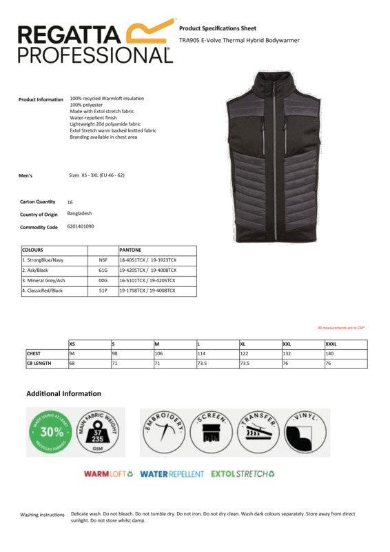 The E-Volve unisex thermal hybrid bodywarmer, from Regatta Professional, is the perfect work layer. This men’s gilet is made with Extol stretch fabric, providing comfort and freedom of movement. There's Warmloft insulation and a water-repellent finish to ward off the rain and cold. Add your own branding to the chest area. REACH, GRS certified fabric and ETI compliant factory certified.The E-Volve unisex thermal hybrid bodywarmer, from Regatta Professional, is the perfect work layerThis men’s gilet is made with Extol stretch fabric, providing comfort and freedom of movementThere's Warmloft insulation and a water-repellent finish to ward off the rain and coldAdd your own branding to the chest areaREACH, GRS certified fabric and ETI compliant factory certified.Accreditations: Reach|Global Recycled StandardAge Group: AdultFabric: 90% Polyester, 10% ElastaneGender: UnisexPlus Size: YesProduct Type: Gilets & Body WarmersSize Range: XS–3XLSizing To Fit: XS 36″ S 38″ M 40″ L 42″ XL 44″ 2XL 47″ 3XL 50″Tag: Sewn TagWashing Instructions: Cool wash. Do not bleach. Do not tumble dry. Do not iron. Do not dry clean.Weight (GSM): Nylon: 37gsm. Stretch: 235gsm]]>