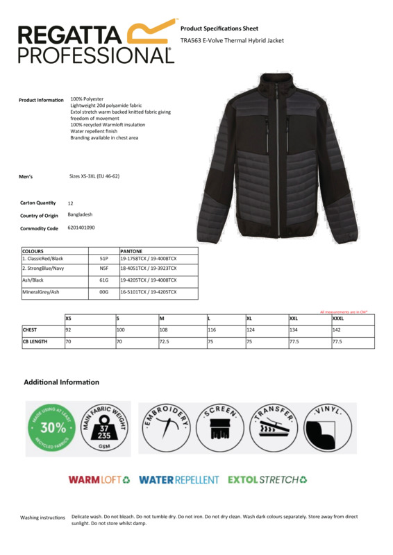 The E-Volve thermal hybrid jacket, from Regatta Professional, is the perfect work layer. This zip-up is made with Extol stretch fabric, providing you with comfort and freedom of movement. There’s Warmloft insulation and a water-repellent finish to ward off the rain and cold. Add your own branding to the chest area. REACH, GRS certified fabric and ETI compliant factory certified.The E-Volve thermal hybrid jacket, from Regatta Professional, is the perfect work layerThis zip-up is made with Extol stretch fabric, providing you with comfort and freedom of movementThere’s Warmloft insulation and a water-repellent finish to ward off the rain and coldAdd your own branding to the chest areaREACH, GRS certified fabric and ETI compliant factory certified.Accreditations: Reach|Global Recycled StandardAge Group: AdultFabric: 90% Polyester, 10% ElastaneGender: UnisexPlus Size: YesProduct Type: JacketsSize Range: XS–3XLSizing To Fit: XS 36″ S 38″ M 40″ L 42″ XL 44″ 2XL 47″ 3XL 50″Tag: Sewn TagWashing Instructions: Cool wash. Do not bleach. Do not tumble dry. Do not iron. Do not dry clean.Weight (GSM): Nylon: 37gsm. Stretch: 235gsm]]>