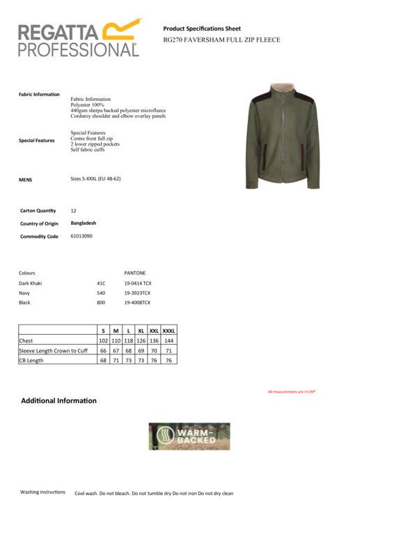 The Faversham full-zip fleece from Regatta Professional. With a country feel, strategic overlays and heavyweight fleece, this is perfect for staying warm in style. It features a cosy warm-backed fleece and durable heavyweight construction that will keep you warm, protected and on trend – and perfect for working on the farm or country estate. Valuables are kept safe in the zipped pockets, the corduroy shoulder adds style, and elbow overlay panels provide lasting wear.440gsm warm-backed polyester microfleeceCorduroy shoulder and elbow overlay panels2 lower zipped pocketsSelf-fabric cuffsReach certifiedEthical Trading Initiative certified.Accreditations: Ethical Trading Initiative|ReachAge Group: AdultFabric: 100% PolyesterGender: MalePlus Size: YesProduct Type: FleeceSize Range: S to 3XLSizing To Fit: S 38″ M 40″ L 42″ XL 44″ 2XL 47″ 3XL 50″Tag: Sewn TagWashing Instructions: Cool wash. Do not bleach. Do not tumble dry. Do not iron. Do not dry-clean.Weight (GSM): 440gsm]]>