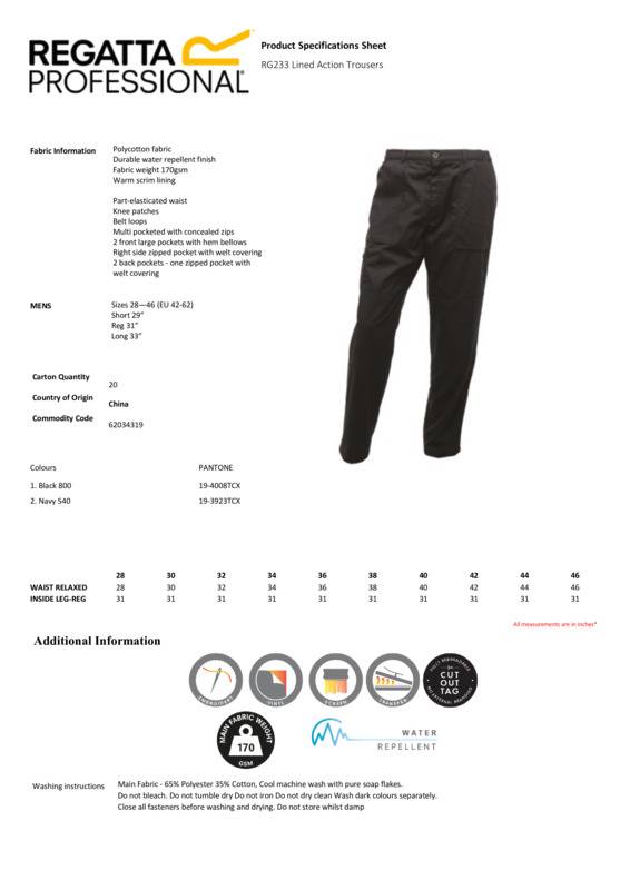 No matter what work throws at you and how bad the weather is, you'll be prepared in the Lined action trousers. Not only do the work trousers comes with a water-repellent finish, they have a warm scrim lining to keep you toasty. The polycotton blend provides comfort and durability.Part-elasticated waistKnee patchesBelt loopsMulti-pocketed with concealed zips2 front large pockets with hem bellowsRight side zipped pocket with welt covering2 back pockets - one zipped pocket with welt covering.Age Group: AdultFabric: Polycotton fabricGender: MaleLeg Length: Leg length: Short 29″, Regular 31″, Long 33″Plus Size: YesProduct Type: TrousersSize Range: 28″ to 46″Short,Reg,LongSizing To Fit: 28″ 30″ 32″ 34″ 36″ 38″ 40″ 42″ 44″ 46″Tag: Sewn TagWashing Instructions: Cool machine wash with pure soap flakes. Do not bleach. Do not tumble dry Do not iron Do not dry clean Wash separately. Close all fasteners before washing and drying. Do not store whilst damp.Weight (GSM): 170gsm]]>