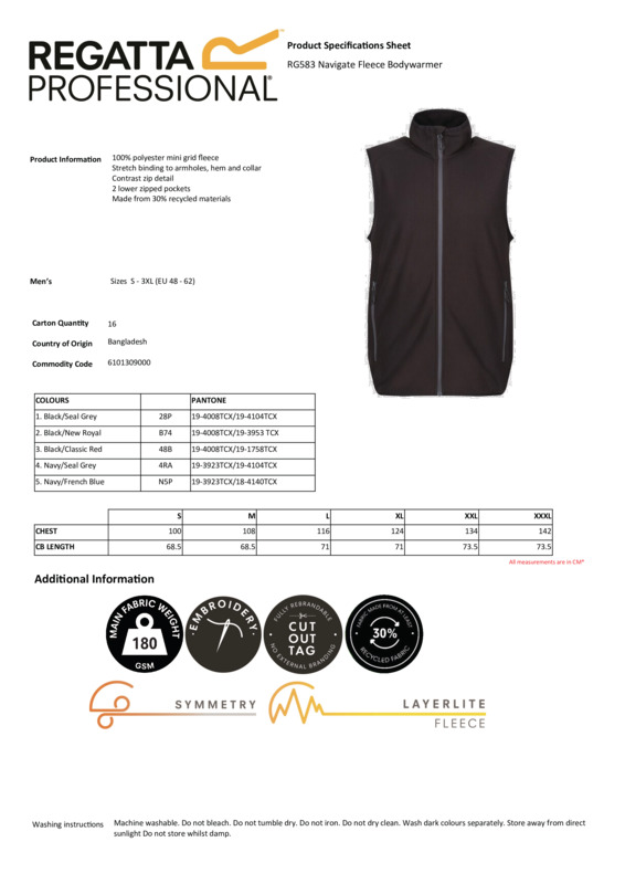 The men’s Navigate fleece bodywarmer from Regatta Professional is a wardrobe essential. Featuring durable yet lightweight fabric, it provides lasting wear, whether heading to work or the hills. Pop it under a jacket for extra warmth or use as an outer layer for ultimate agility.Cosy, warm and lightweight, the men’s Navigate fleece bodywarmer is the ideal mid-layer for your winter wardrobeFeaturing Layerlite fabric, this fleece is perfect for busy professionals – wear it underneath a jacket for extra warmth or as an outer layer in milder weather.Age Group: AdultFabric: Polyester 100%Gender: MalePlus Size: YesProduct Type: FleeceSize Range: S–3XLSizing To Fit: S 38″ M 40″ L 42″ XL 44″ 2XL 47″ 3XL 50″Tag: Sewn TagWashing Instructions: Machine washable. Do not bleach. Do not tumble dry. Do not iron. Do not dry clean.Weight (GSM): 180gsm]]>