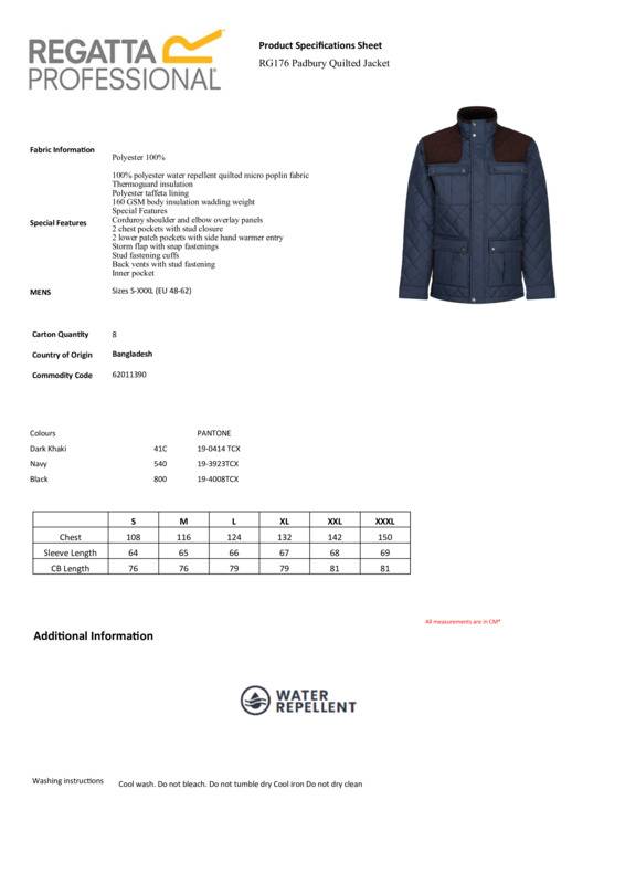 The Padbury diamond quilt jacket from Regatta Professional. Water-repellent and Thermoguard-insulated, it’s perfect for getting the job done in cold weather. Featuring water-repellent fabric, this jacket is ideal for working on the farm or country estate or at the stables, and the corduroy shoulder and elbow overlay panels enhance the country-casual style.100% polyester water-repellent quilted micro poplin fabric, 160gsmThermoguard body insulationCorduroy shoulder and elbow overlay panelsMultiple pockets, including inner security pocketReach certifiedEthical Trading Initiative certified.Accreditations: Ethical Trading Initiative|ReachAge Group: AdultFabric: 100% PolyesterGender: MalePlus Size: YesProduct Type: JacketsSize Range: S to 3XLSizing To Fit: S 38″ M 40″ L 42″ XL 44″ 2XL 47″ 3XL 50″Tag: Sewn TagWashing Instructions: Cool wash. Do not bleach. Do not tumble dry. Cool iron. Do not dry-clean.Weight (GSM): 164gsm]]>