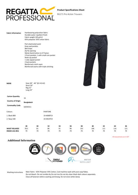 When you're grafting hard at work, the Pro action trousers provide the perfect protective layer. Crafted from a polycotton blend, the men's work trousers are long-lasting and will help to keep you comfortable whatever the job.Hardwearing polycotton fabric with water-repellent coatingMulti zip pocket design with 8 pocketsPart elasticated waistband and triple stitched seams with reinforced crotchKneepad pockets compatible with Regatta kneepads.Age Group: AdultFabric: 65% Polyester, 35% CottonGender: MaleLeg Length: Leg length: Short 29″, Regular 31″, Long 33″Plus Size: YesProduct Type: TrousersSize Range: 28S to 46LSizing To Fit: 28″ 30″ 32″ 34″ 36″ 38″ 40″ 42″ 44″ 46″Tag: Sewn TagWashing Instructions: Cool wash. Do not bleach. Tumble dry on low setting. Cool iron. Do not dry clean.Weight (GSM): 245gsm]]>