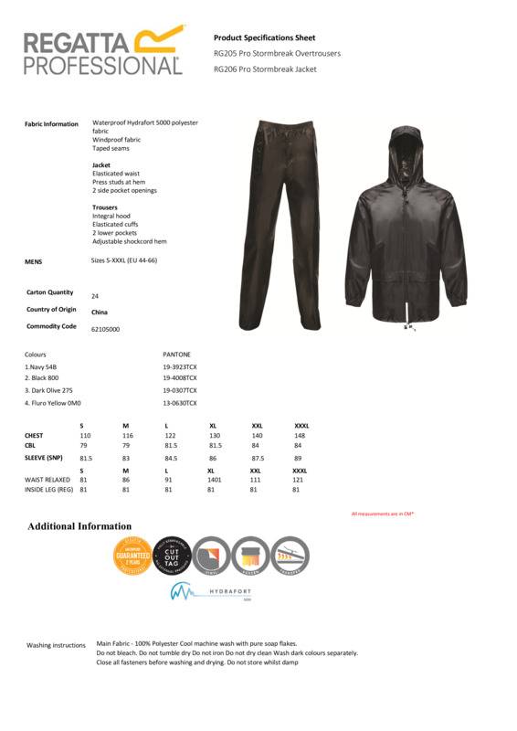 Protect your baselayers with the Pro Stormbreak overtrousers. The men's overtrousers are perfect for outdoor labourers. The trousers are waterproof and are made from a polyester fabric, so they're sure to withstand the rigours of daily graft. An elasticated waist allows for ease of movement.Fabric information; waterproof Hydrafort 5000 polyester fabricWindproof fabricTaped seamsSpecial features; elasticated waist, press studs at hem and 2 side pocket openings.Age Group: AdultFabric: 100% PolyesterGender: MaleLeg Length: Regular 31″Plus Size: YesProduct Type: TrousersSize Range: S to 3XLSizing To Fit: S 32″ M 33/34″ L 36″ XL 38/40″ 2XL 42/48″ 3XL 46/48″Tag: Sewn TagWashing Instructions: Delicate wash. Do not bleach. Tumble dry on lowsetting Use cool iron on outer side Do not dry cleanWash dark colours separately. Close all fastenersbefore washing and drying. Do not store whilst damp.Weight (GSM): 185gsm]]>