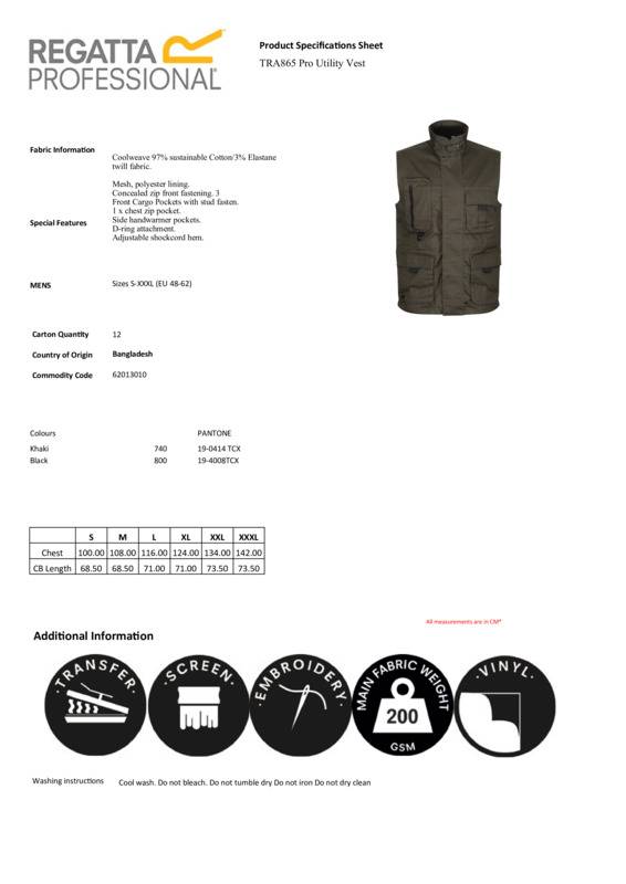 The Pro utility vest from Regatta Professional. Comfortable, sustainable and in a military design, this is perfect on-the-go wear and made from sustainable Coolweave cotton for a cool and comfortable feel. The utility design provides the style and the mesh lining adds to the comfort, while multiple pockets offer plenty of space for essentials.Coolweave 97% sustainable cotton, 3% elastane twill fabricPolyester mesh liningMulti-pocketed design including side handwarmer pocketsAdjustable shock cord hem systemReach certifiedEthical Trading Initiative certified.Accreditations: Ethical Trading Initiative|ReachAge Group: AdultFabric: 97% Coolweave sustainable cotton, 3% Elastane twill fabricGender: MaleProduct Type: Gilets & Body WarmersSize Range: S to 3XLSizing To Fit: S 38″ M 40″ L 42″ XL 44″ 2XL 47″ 3XL 50″Tag: Sewn TagWashing Instructions: Cool wash. Do not bleach. Do not tumble dry. Do not iron. Do not dry-clean.Weight (GSM): 200gsm]]>