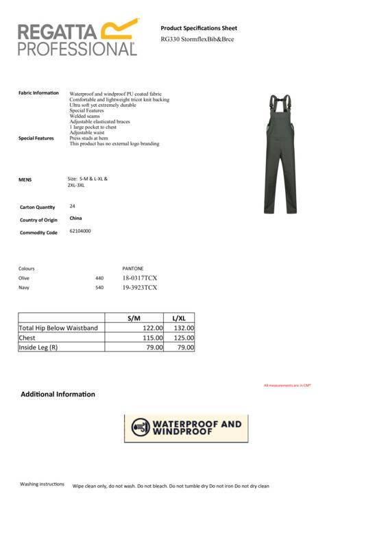 The Stormflex bib and brace from Regatta Professional is made from a waterproof/windproof fabric. Perfect for getting on with the job in harsh weather, it features waterproof PU-coated fabric which helps protect against rain and work splashes. The knitted fabric to the back is lightweight, for extra comfort. Personalise the fit with the adjustable braces and waist. Ideal for farm work, gardening, manual labour and much more.Highly breathable waterproof and windproof PU-coated fabricComfortable and lightweight tricot knit backingAdjustable elasticated braces and adjustable waist1 large pocket to chest and adjustable hemReach certifiedEthical Trading Initiative certified.Accreditations: Ethical Trading Initiative|ReachAge Group: AdultFabric: Polyester 100%Gender: MalePlus Size: YesProduct Type: DungareesSize Range: S/M to 2XL/3XLSizing To Fit: S/M 38/40″ L/XL 42/44″ 2XL/3XL 47/50″Tag: Sewn TagWashing Instructions: Wipe clean only. Do not wash. Do not bleach. Do not tumble dry. Do not iron. Do not dry-clean.Weight (GSM): 226gsm]]>