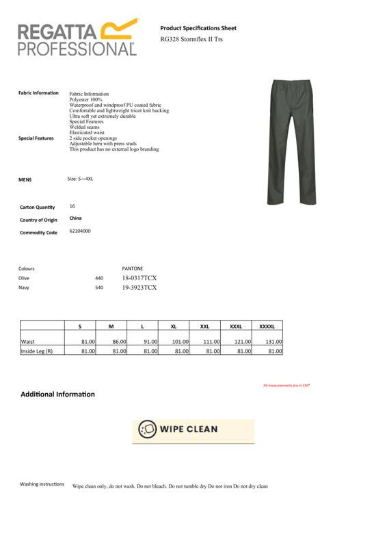 The Stormflex II overtrousers from Regatta Professional. Breathable, lightweight and waterproof – perfect for getting the job done. They feature a waterproof and windproof fabric with a stylish PU finish, as well as a comfortable, lightweight knit backing, so are ideal for winter working on the farm, country estate or at the stables.Highly breathable waterproof and windproof PU-coated fabricComfortable and lightweight tricot knit backingElasticated waist and adjustable hem with press studs2 side pocket openingsReach certifiedEthical Trading Initiative certified.Accreditations: Ethical Trading Initiative|ReachAge Group: AdultFabric: 100% PolyesterGender: MalePlus Size: YesProduct Type: TrousersSize Range: S to 4XLSizing To Fit: S 38″ M 40″ L 42″ XL 44″ 2XL 47″ 3XL 50″ 4XL 53″Tag: Sewn TagWashing Instructions: Wipe clean only. Do not wash. Do not bleach. Do not tumble dry. Do not iron. Do not dry-clean.Weight (GSM): 226gsm]]>