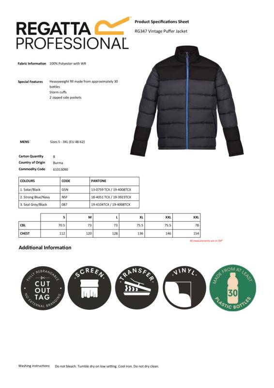 The men’s Vintage puffer jacket from Regatta Professional has the perfect winter combination of protection and style, with a heavyweight recycled fill to keep you warm and snug, plus storm cuffs to keep the elements out.The Vintage men's puffer jacket from Regatta Professional blends protection and style - the perfect winter combinationThe men's padded jacket comes with a heavyweight recycled fill that'll keep you warm and snugThe storm cuffs keep the elements out.Age Group: AdultFabric: 100% PolyesterGender: MalePlus Size: YesProduct Type: JacketsSize Range: S – 3XLSizing To Fit: S 38″ M 40″ L 42″ XL 44″ 2XL 47″ 3XL 50″Tag: Tear-outWashing Instructions: Cool machine wash with Regatta Isotex cleaner or pure soap. Do not bleach. Tumble dry on low setting. Cool iron. Do not dry clean.Weight (GSM): 60gsm]]>