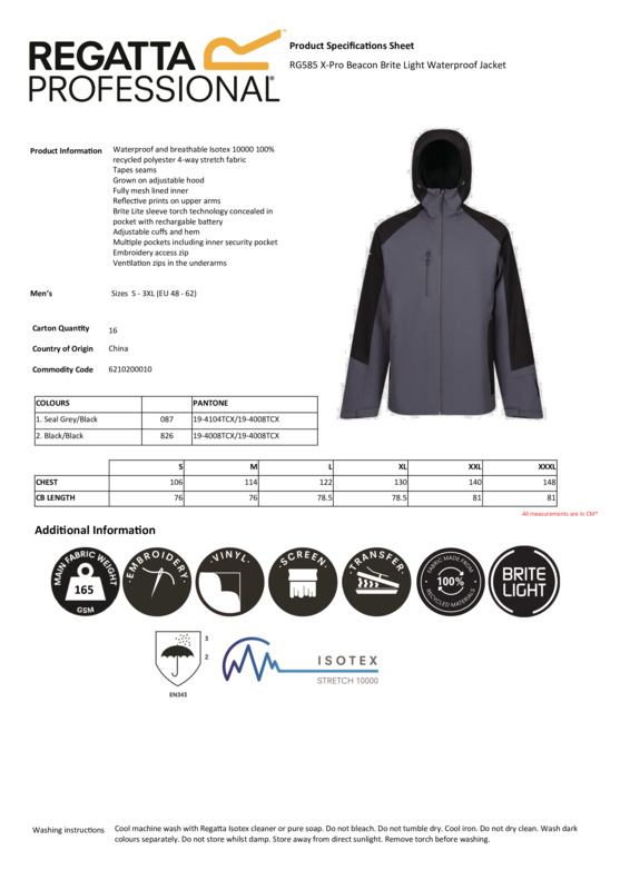 The men’s X-Pro Beacon Brite Light waterproof jacket from Regatta Professional is perfect for the daily commute. The recycled waterproof layer is packaged up in a lightweight design, so it’s perfect for packing away when you’re on the go. Planning an after-work adventure? The built-in torch will light the way.Waterproof, high-tech and lightweight, the men’s X-Pro Beacon Brite Light waterproof jacket will help you tackle the daily commute in styleFeaturing Isotex 10000, the waterproof shell is packaged up in a stretchy lightweight design, so you’ll stay comfortable in any weatherWhen daylight fades, the torch will guide your way home.Age Group: AdultFabric: Polyester 100%Gender: MalePlus Size: YesProduct Type: JacketsSize Range: S–3XLSizing To Fit: S 38″ M 40″ L 42″ XL 44″ 2XL 47″ 3XL 50″Tag: Sewn TagWashing Instructions: Cool machine wash with Regatta Isotex cleaner or pure soap. Do not bleach. Do not tumble dry. Cool iron. Do not dry clean.Weight (GSM): 165gsm]]>