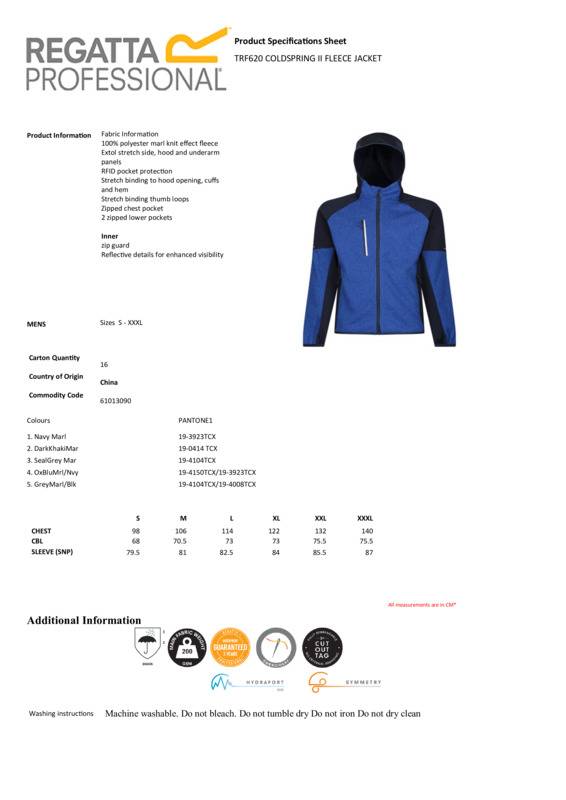 Say hello to the perfect midlayer with the Coldspring II. The men's full-zip fleece features a unique marl knit finish and comes with extol stretch sides for great movement. Feel secure and comfortable with the thumbhole cuffs.Warm backed marl knit fleece with extol stretch sides, hood and underarm panelsRFID protection on the chest pocket for added securityGrown on hood and stretch binding to hood opening, hem and thumbhole design cuffs2 zipped lower pockets and 1 zipped chest pocket, with chin guard and reflective details.Age Group: AdultFabric: 70% Cotton, 30% PolyesterGender: MalePlus Size: YesProduct Type: JacketsSize Range: S to 3XLSizing To Fit: S 38″ M 40″ L 42″ XL 44″ 2XL 47″ 3XL 50″Tag: Tear-outWashing Instructions: Cool wash. Do not bleach. Do not tumble dry. Do not iron. Do not dry clean.]]>