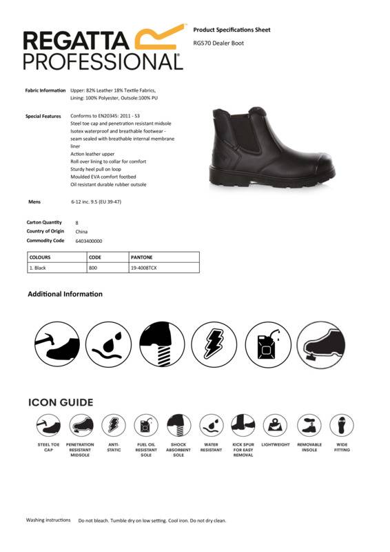 Waterproof S3 Dealer boots from Regatta Professional are perfect for long days on the job. These men’s work boots feature a steel toecap, making them ideal for potentially hazardous conditions, and rain won’t get a look in with the waterproof Isotex fabric. They come with a moulded EVA footbed to keep feet happy, all day long. Conforms to EN20345: 2011 - S3 SRC WR.Steel toecap and penetration-resistant midsoleIsotex waterproof and breathable footwear – seam sealed with breathable internal membrane linerConforms to EN20345: 2011 - S3 SRC WR.Age Group: AdultFabric: Upper: 82% Leather, 18% Textile fabrics. Lining: 100% Polyester. Outsole: 100% PUGender: MalePlus Size: NoProduct Type: BootsSize Range: 7 – 12Sizing To Fit: 7 41 8 42 9 43 10 44 11 46 12 47Tag: Sewn TagWeight (GSM): 245gsm]]>