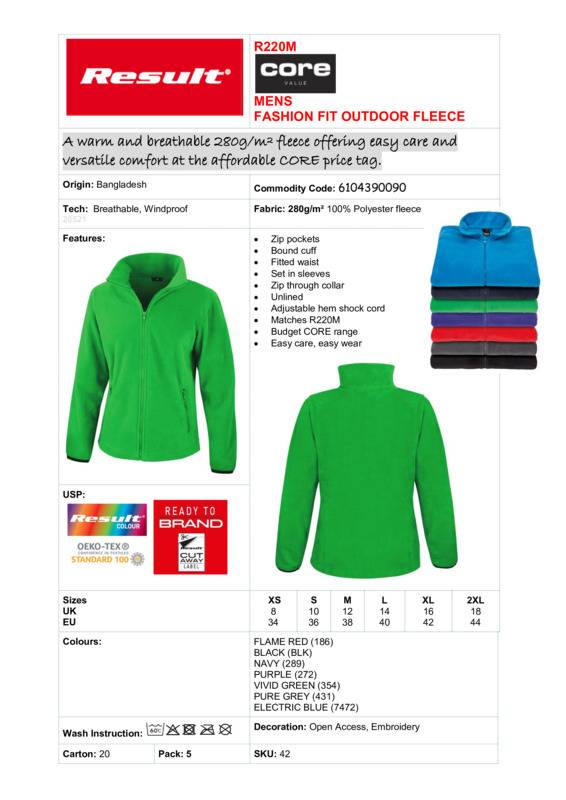 Luxurious soft feel fleece, CORE value price, great fashion fit, super lightweight but warm, your perfect fleece partner.Strong front and pocket zipAdjustable hem shock cordEasy-care and easy wearFashion fitSet-in sleevesLuxurious soft-feel fabricSide hem drawcord size adjusterDouble stitch detailingBound cuff Decorating methods: Embroidery, digital transfer print Decorators access point: open.Accreditations: Oeko-TexAge Group: AdultFabric: Outer: 100% Polyester, 280gsm luxury plush compact feel fleeceGender: MalePlus Size: YesProduct Type: FleeceSize Exclusions: *XS only available in these coloursSize Range: XS to 3XLSizing To Fit: XS 33″ S 38″ M 41″ L 44″ XL 47″ 2XL 50″ 3XL 53″Tag: Sewn TagWashing Instructions: 30 degrees. Do not bleach. Do not tumble dry. Do not iron. Do not dry cleanWeight (GSM): Outer: 280gsm]]>