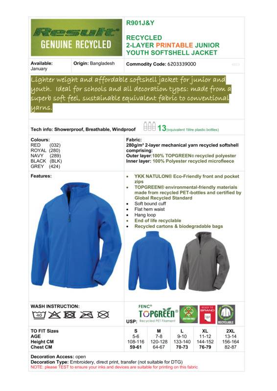 A lighter-weight and affordable softshell jacket for juniors and youths. Ideal for schools and all decoration types, and made from a superb, soft-feel, sustainable fabric.ShowerproofBreathableWindproofYKK NATULON® eco-friendly front and pocket zipsEnvironmentally-friendly materials made from (13) recycled PET bottles and certified by Global Recycled StandardSoft bound cuffFlat hem waistHang loop2-layer mechanical yarn comprising 100% recycled polyester outer and 100% polyester microfleece backing.Age Group: KidsFabric: 100% Recycled polyester. Inner layer: 100% Polyester microfleeceGender: UnisexPlus Size: NoProduct Type: SoftshellsSize Exclusions: *Size 13/14 is VATableSize Range: S – 2XLSizing To Fit: S 5/6 M 7/8 L 9/10 XL 11/12 2XL 13/14Tag: TaglessWashing Instructions: Gentle machine wash 40 ?. Do not bleach. Do not iron. Do not dry clean. Do not tumble dry.Weight (GSM): 280gsm]]>