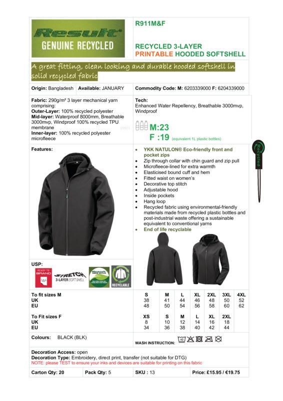A great-fitting, clean-looking and durable hooded men’s softshell made from recycled fabric.Enhanced water repellencyBreathable 3,000mvpWindproofYKK NATULON® eco-friendly front and pocket zipsZip-through collar with chin guard and zip pullMicrofleece-lined for extra warmthElasticised bound cuff and hemDecorative top stitchAdjustable hoodInside pocketsHand loopRecycled fabric using environmentally-friendly materials made from (23) recycled bottles and post-industrial waste3-layer mechanical yarn comprising 100% recycled polyester outer; waterproof 8,000mm, breathable 3,000mvp, windproof mid-layer and 100% recycled polyester microfleece inner layer.Age Group: AdultFabric: 100% Recycled polyester. Mid-layer: 100% Recycled TPU membrane. Inner layer: 100% Polyester microfleeceGender: MalePlus Size: YesProduct Type: SoftshellsSize Range: S – 4XLSizing To Fit: S 38″ M 41″ L 44″ XL 46″ 2XL 48″ 3XL 50″ 4XL 52″Tag: TaglessWashing Instructions: Gentle machine wash 40 ?. Do not bleach. Do not iron. Do not dry clean. Do not tumble dry.Weight (GSM): 290gsm]]>