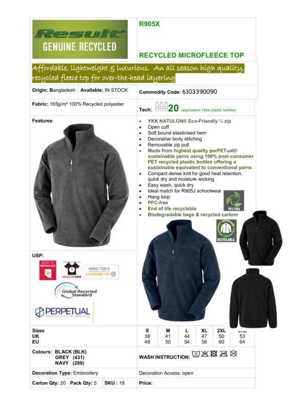 Affordable, lightweight and luxurious recycled fleece top, ideal all season, over-the-head layering for event wear and uniform.Recycled fleece top with 1/4 front YKK NATULON® Eco-friendly zipSoft bound elasticised cuffs and hemDecorative body stitchingMade from highest quality perPETual© sustainable yarns using 100% post-consumer PET recycled plastic bottles offering a sustainable equivalent to conventional yarnsCompact dense knit for good heat retention, quick-dry and moisture-wickingEasy wash, quick-dryHang LoopPFC-freeEnd of life recyclableBiodegradable bags and recycled cartonsOeko-Tex certified.Accreditations: Oeko-Tex|Global Recycled StandardAge Group: AdultFabric: 100% Recycled polyesterGender: UnisexPlus Size: YesProduct Type: FleeceSize Range: S to 3XLSizing To Fit: S 38″ M 41″ L 44″ XL 47″ 2XL 50″ 3XL 53″Tag: Tear-outWashing Instructions: Machine wash 40 °.Do not bleach. Do not iron. Do not Dry clean. Do not tumble dry.Weight (GSM): 165gsm]]>