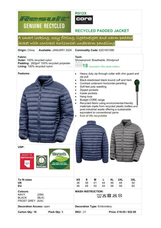 A smart-looking, cosy-fitting, lightweight yet warm padded jacket with contrast horizontal underarm panelling.ShowerproofBreathableWindproofHeavy-duty zip-through collar with chin guard and zip pullBlack elasticised bound cuff and hemSoft-feel poly waddingZipped pocketsInside pocketsHand loopContrast underarm horizontal panellingFashionable quilted designRecycled fabric using environmentally-friendly materials made from (18) recycled plastic bottles and post-industrial waste.Age Group: AdultFabric: 100% Recycled nylon. Padding: 100% Recycled polyester. Lining: 100% Recycled nylonGender: MalePlus Size: YesProduct Type: JacketsSize Range: XS – 3XLSizing To Fit: XS 36″ S 38″ M 41″ L 44″ XL 46″ 2XL 48″ 3XL 50″Tag: TaglessWashing Instructions: Gentle machine wash 40 ?. Do not bleach. Do not iron. Do not dry clean. Do not tumble dry.Weight (GSM): 260gsm]]>