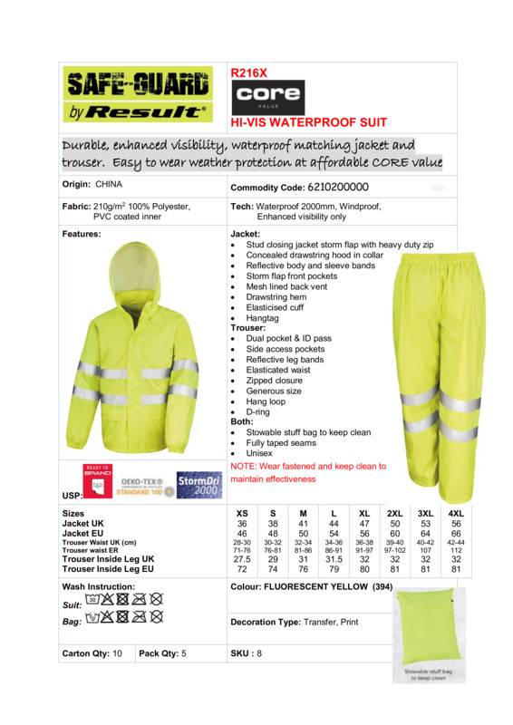 Best value Hi-viz protection in this waterproof, windproof and reflective work suit. Supplied in it's own stowable stuff bag to keep it clean this suit is a real heavy duty cover all when you need to stay seen and stay dry as the weather takes a turn for the worst.Waterproof 2000mm and windproof protectionStowable bagStormDri 2000 fabricJACKET: Stud closing outer storm flap with heavy duty zipDrawstring hemIntegral drawstring hoodFront pockets with stormflapElasticised cuffTaped seamsHangtagMesh-lined back ventReflective body bandsTROUSER: Side access pocketsElasticised waistReflective leg bandsTaped seams Decorating methods: Transfer print, direct printDecorators access point: open.Accreditations: Oeko-TexAge Group: AdultFabric: 100% Polyester, PVC coatingGender: UnisexPlus Size: YesProduct Type: Rain SuitsSize Range: XS to 4XLSizing To Fit: XS 36″ S 38″ M 41″ L 44″ XL 47″ 2XL 50″ 3XL 53″ 4XL 56″Tag: Sewn TagWeight (GSM): 210gsm]]>