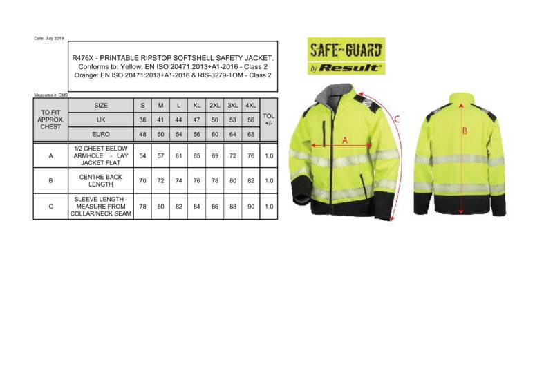 Printable ripstop fabric with durable water-repellent finish. Breathable. Windproof. A soft stretch, high visibility safety garment.Printable ripstop fabric with durable water-repellent finishBreathableWindproofBlack colour contrast in strong Oxford nylon masks grimeFleece linedSoft-feel, supple reflective printed safety body bandsYKK zipStand-up collarZipped pocketsChin guardOpen cuffHangtagReady to brand - tag freeEN ISO 20471:2013+A1-2016 - Class 2RIS-3279-TOM - Class 2 (Orange only)Oeko-Tex certified.Accreditations: Oeko-TexAge Group: AdultFabric: 310gsm 3-layer mechanical yarn comprising: Outer layer: 100% Ripstop polyester. Mid-layer: Waterproof 8000mm, breathable 1000mvp and windproof TPU membrane. Inner-layer:100% Polyester microfleece. Shoulder panels: 100% Polyester OxfordGender: MalePlus Size: YesProduct Type: SoftshellsSize Range: S to 4XLSizing To Fit: S 38″ M 41″ L 44″ XL 47″ 2XL 50″ 3XL 53″ 4XL 56″Tag: TaglessWashing Instructions: Machine wash 40°. Do not bleach. Iron low. Do not tumble dry. Do not dry clean.Weight (GSM): 310gsm]]>