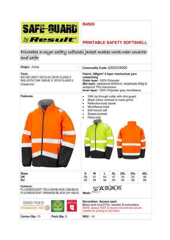 A high visibility, on-trend lightweight and warm softshell jacket. Durable water-repellent finish, breathable, and windproof.EN ISO 20471:2013+A1:2016 CLASS 2 RIS-3279-TOM (ORANGE ONLY)Durable water-repellent finishBrearthableWindproofMicrofleece linedLightweight and warmSoft stretch printable high visibilityReflective tape body bandsHang tagBlack lower panel masks grimeStand-up collarQuiet to wearZipped pocketsReady to brandOeko-Tex certified.Decoration Guidelines: Embroidery, Screen print & Transfer printDecorators access point: openAccreditations: Oeko-TexAge Group: AdultFabric: 280gsm 3-layer mechanical yarn comprising: Outer-layer: 100% Polyester. Mid-layer: Waterproof 8000mm, breathable 1000g and windproof TPU membrane. Inner-layer: 100% Polyester microfleeceGender: MalePlus Size: YesProduct Type: SoftshellsSize Range: S to 4XLSizing To Fit: S 38″ M 41″ L 44″ XL 47″ 2XL 50″ 3XL 53″ 4XL 56″Tag: TaglessWashing Instructions: Machine wash 40°. Do not bleach. Do not iron. Do not tumble dry. Do not dry clean.Weight (GSM): 280gsm]]>