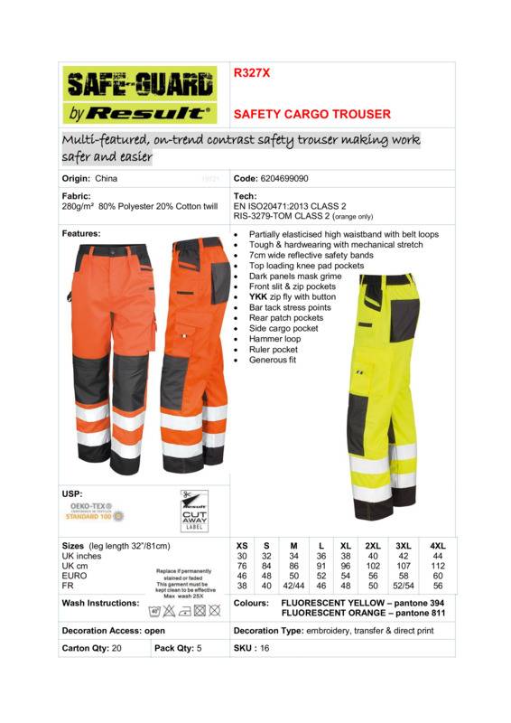 Functionality and high visibility performance are delivered without compromise in these tough and rugged safety cargo trousers. Multiple pockets, bar tacked stress points and hammer loop bring the performance whilst elasticated waistband, knee pad pockets and reflective leg bands bring the comfort and safety. Everything you expect and more from an EN20471 Class 2 safety trouser.Partially elasticised waistband with belt loopsFront zip with button fasteningHigh rear comfort waistbandRear patch and ruler pocketsFront slit and zip pocketsBlack contrast panelsBar tack stress pointsReflective Hi-Viz leg bandsSide cargo pocketKneepad pocketsHammer loopGenerous fitReady to band cut away labelTough and hardwearing with mechanical stretchEN ISO20471:2013 CLASS 2RIS-3279-TOM CLASS 2: Issue 2:2019 (orange only)Oeko-Tex certifiedDecorating methods: EmbroideryDecorators access point: Inside left chest and back hidden zipsAccreditations: Oeko-TexAge Group: AdultFabric: 80% Polyester, 20% Cotton twillGender: UnisexPlus Size: YesProduct Type: TrousersSize Range: XS to 4XLSizing To Fit: XS 30″ S 32″ M 34″ L 36″ XL 38″ 2XL 40″ 3XL 42″ 4XL 44″Tag: Tear-outWashing Instructions: Wash at 40 degree. Do not bleach. Medium heat iron. Do not tumble dry. Do not dry-clean. Replace if permanently stained or faded. This garment must be kept clean to be effective. Max wash 25XWeight (GSM): 280gsm]]>