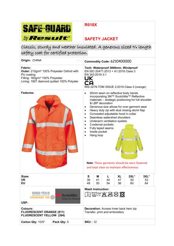 Certified protection and optimal performance sums up this 3/4 length safety jacket for all year round use. With EN ISO 20471:2013 class 3 visibility and GO/RT classification on the orange version you really need to look no further to be seen!EN ISO 20471:2013 + A1:2016 Class 3EN 343:2019 3:1RIS-3279-TOM ISSUE 2:2019 Class 3 (orange)Waterproof 3000mmWindproof50mm sewn on reflective body bands incorporating 3M™ Scotchlite™ Reflective materials – strategic positioning for full shoulder and LBP decorationGenerous size allows for over garment wearHeavy duty zip with stud closing storm flapConcealed adjustable hood in collarSeamless watershed shouldersUnderarm ventilation eyelets3 external pocketsFully taped seamsInside pocketHang loopNote: These garments should be worn fastened and kept clean to maintain effectivenessConforms to 89/686/EEC directiveOeko-Tex certifiedDecorating methods: Embroidery, transfer print, direct printDecorator access point: Inner back hem zip.Accreditations: Oeko-TexAge Group: AdultFabric: Outer: Polyester Oxford with PU coating insulation, 160gsm polyester wadding. Lining: 190T diamond quilted polyesterGender: MalePlus Size: YesProduct Type: JacketsSize Range: S to 3XLSizing To Fit: S 38″ M 41″ L 44″ XL 47″ 2XL 50″ 3XL 53″Tag: Sewn TagWashing Instructions: Do not bleach. Do not iron. Do not dry clean. Do not tumble dryWeight (GSM): 210gsm]]>