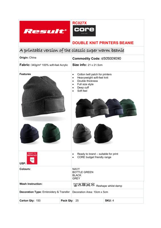 A printable version of the classic warm beanie.Cotton twill printers patch on deep cuffHeavyweight soft-feel knitDouble thicknessFull-size styleReady to brand - tag freeDecoration area: 10 x 5cmTransfer guidance: unfold the beanie so its flat and insert a heat cushion, this is just to reduce pressure marksOnce its ready to go with the heat cushion inserted place the transfer onto the hat and press with a medium pressure as to the media/vinyl guidelines.Age Group: AdultBag Dimensions: 21 x 21.5cmFabric: 100% Soft-feel acrylicGender: MalePlus Size: NoProduct Type: BeaniesSize Range: OnesizeSizing To Fit: One sizeTag: TaglessWashing Instructions: Machine wash 40°. Do not bleach. Iron low. Do not tumble dry. Do not dry clean. Reshape whilst damp.Weight (GSM): 340gsm]]>