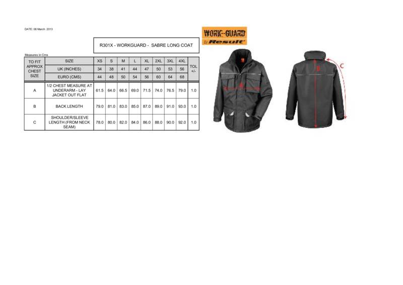 With it's super tough fabrics engineered for durability and strength this is one manager style long coat that no hard working professional can afford to be without! Incorporating taped seams, storm flap, D-ring and reflective piping the Sabre Long Coat's real winning feature is the semi removable left breast pocket allowing easy access for embroidery or print. This along with the interchangeable zip pulls for corporate colour matching makes the R301X a tough act to follow with a price point to pleasantly surprise.Full front heavy duty zipFully taped seamsTear release storm flapConcealed hood with adjustable drawcordDeep front patch pockets, with soft feel microfleece hand warmer packet accessSemi detachable left chest pocket with tear release/stud and zip closure for access or decorationMulti-feature right chest pocketInside chest pocketReflective detail across chest and pocketsElasticated cuff with tear release adjusterDiamond quilted liningInterchangeable colour zip pull systemHanging loopSoft feel microfleece lined stand-up collarD RingCritical seam twin needling.Decoration Guidelines:Decorating methods: Embroidery & Transfer printDecorators access point: Outer left chest & Inside lower backOeko-Tex certified.Accreditations: Oeko-TexAge Group: AdultFabric: Outer: 320gsm 100% Oxford polyester with PVC coating. Lining: 190T 100% Polyester. Filling: 160gsm 100% Polyester waddingGender: MalePlus Size: YesProduct Type: JacketsSize Range: XS to 4XLSizing To Fit: XS 34″ S 38″ M 41″ L 44″ XL 47″ 2XL 50″ 3XL 53″ 4XL 56″Tag: Sewn TagWashing Instructions: 30 degrees. Do not bleach. Iron on low heat. Do not tumble dry. Do not dry clean]]>