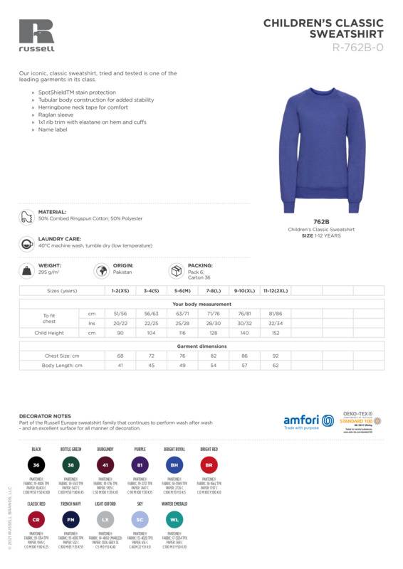 The iconic, classic sweatshirt, tried and tested is one of the leading garments in its class.Twin needle coverseams on neck, raglan sleeve, cuffs and waistband for extra durabilityHerringbone back neck tapeSpotshield™ stain resistant coating for fabric protectionfade resistantBSCI certified.Accreditations: Amfori BSCI|Oeko-TexAge Group: AdultFabric: 50% Combed ringspun cotton, 50% PolyesterGender: MalePlus Size: YesProduct Type: SweatshirtsSize Exclusions: *3XL and 4XL only available in these coloursSize Range: XS to 4XLSizing To Fit: XS 34/36″ S 36/38″ M 38/40″ L 40/42″ XL 42/44″ 2XL 44/46″ 3XL* 46/48″ 4XL* 48/50″Sustainable: YesTag: Sewn TagWashing Instructions: Suitable for 40C wash and tumble dryWeight (GSM): 295gsm]]>