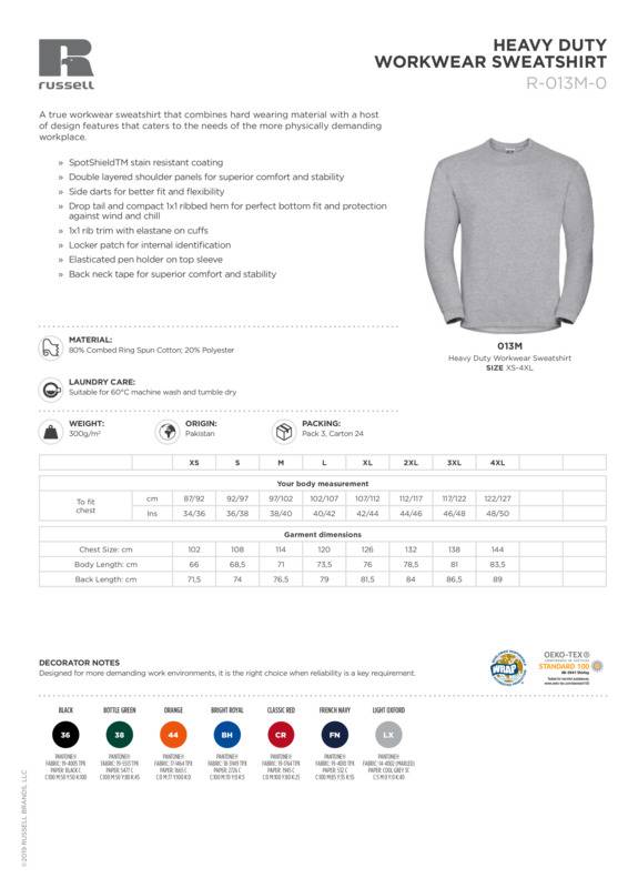 A true workwear sweatshirt that combines hard-wearing material with a host of design features that caters to the needs of the more physically demanding workplace.Suitable for 60°C wash and tumble drySpotShieldTM stain resistant coating for fabric protectionDouble layer fabric on shoulder for added durabilityLocker patch for internal identificationElasticated pen holder on top sleeve1x1 rib trim with Elastane on hem and cuffDrop tail for a comfortable working fitWRAP certified.Accreditations: Oeko-Tex|WRAPAge Group: AdultFabric: 80% Combed ringspun cotton, 20% PolyesterGender: MalePlus Size: YesProduct Type: SweatshirtsSize Range: XS to 3XLSizing To Fit: XS 34/36″ S 36/38″ M 38/40″ L 40/42″ XL 42/44″ 2XL 44/46″ 3XL 46/48″ 4XL 48/50″Tag: Sewn TagWashing Instructions: Suitable for 60C wash and tumble dryWeight (GSM): 300gsm]]>