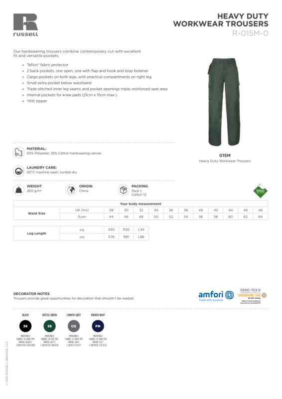 These hard-wearing trousers combine contemporary cut with excellent fit and versatile pockets.Suitable for 60°C wash and tumble dryStain resistant Teflon® coatingInternal pockets for knee padsTriple stitched pocket opening and in seams for additional strengthPhone pouch below waistbandCargo pockets on legs with multi compartments2 back pockets, 1 open, 1 with flap and hook and loop fastening for easy accessYKK zipBSCI certified.Accreditations: Amfori BSCI|Oeko-TexAge Group: AdultFabric: 65% Polyester, 35% CottonGender: MaleLeg Length: Leg length: Short 30″, Regular 32″, Long 34″Plus Size: YesProduct Type: TrousersSize Range: 28″ to 48″Short,Reg,LongSizing To Fit: 28″ 30″ 32″ 34″ 36″ 38″ 40″ 42″ 44″ 46″ 48″Tag: Sewn TagWashing Instructions: 60C WashWeight (GSM): 260gsm]]>