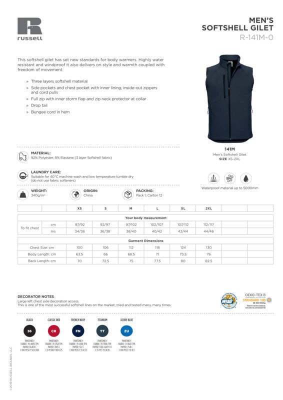 This softshell gilet has set new standards for body warmers. Highly water-resistant and windproof it also delivers on style and warmth coupled with freedom of movement.3 layer softshell fabric with breathable membrane and bonded microfleece lining, water resistant to 5000mmSide pockets and chest pocket with inner lining, reversed zip and cord pullsFull zip with inner storm flap and zip neck protector at collarBungee cord in hemAdjustable cuffsDrop tailLarge left chest side decoration accessFully launderable at 40°CWRAP certified.Accreditations: Oeko-Tex|WRAPAge Group: AdultFabric: 92% Polyester, 8% ElastaneGender: MalePlus Size: YesProduct Type: SoftshellsSize Range: XS to 2XLSizing To Fit: XS 34/36″ S 36/38″ M 38/40″ L 40/42″ XL 42/44″ 2XL 44/46″Tag: Sewn TagWashing Instructions: Suitable for 40C wash and low temperature tumble dry (do not use fabric softeners)Weight (GSM): 340gsm]]>