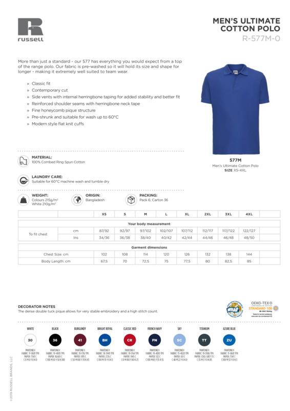 More than just a standard - our 577 has everything you would expect from a top of the range polo. Our fabric is pre-washed so it will hold its size and shape for longer - making it extremely well suited to team wear.Combed cotton fine pique for superior hand feel and durabilityContemporary cut with 3 button placketGarment pre-shrunk and suitable for wash up to 60°C and low tumble dryAn excellent surface for decorationWRAP certified.Accreditations: Oeko-Tex|WRAPAge Group: AdultFabric: 100% Combed cottonGender: MalePlus Size: YesProduct Type: PolosSize Range: XS to 4XLSizing To Fit: XS 34/36″ S 36/38″ M 38/40″ L 40/42″ XL 42/44″ 2XL 44/46″ 3XL 46/48″ 4XL 48/50″Tag: Sewn TagWashing Instructions: Suitable for 60C wash and tumble dryWeight (GSM): White 210gsm, Colours 215gsm]]>