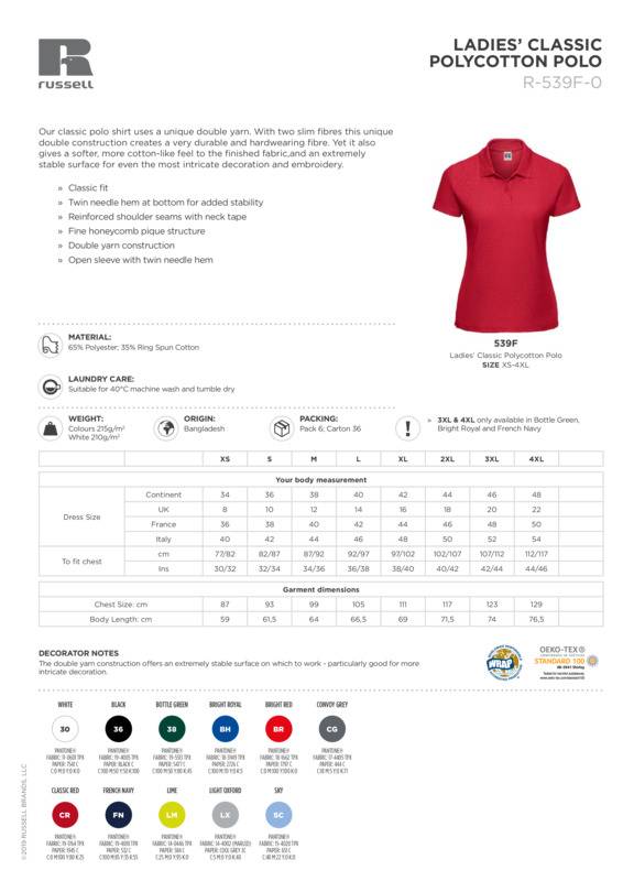 Our classic, tried and tested polo shirt is ideal for all uses, retains its shape, wash after wash - a top all-round performer.Unique double yarn pique provides an exceptionally soft hand feel and increased shape retentionNeck tape for wearer comfort and durabilityOpen sleeve with twin needle hemSide vents for ease of fitSpare button side seamReinforced shoulder seamsTwin needle hem for addded stabilityFitted feminine waistWRAP certified.Accreditations: Oeko-Tex|WRAPAge Group: AdultFabric: 65% Polyester, 35% Ringspun cotton piquéGender: FemalePlus Size: YesProduct Type: PolosSize Exclusions: *3XL and 4XL only available in these coloursSize Range: XS to 4XLSizing To Fit: XS 8 S 10 M 12 L 14 XL 16 2XL 18 3XL* 20 4XL* 22Tag: Sewn TagWashing Instructions: Suitable for 40C wash and tumble dryWeight (GSM): White 210gsm, Colours 215gsm]]>