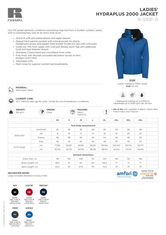 Our 510 jacket perfectly combines everything required from a modern outdoor jacket with a contemporary look at an entry level price.Water resistant garmentPU coated with critically taped seams, fabric is waterproof to 2000mm and breathable: 2000gsm per 24 hoursActive fit, articulated elbows, raglan sleeves and concealed hoodAdvanced features include zipped handwarmer pockets with internal pocket for phone/MP3, storm flap with rain channel, reversed zips and soft touch inner collarConcealed 3 piece hood, fully lined with concealed decoration access at hemYKK zipBSCI certified.Accreditations: Amfori BSCI|Oeko-TexAge Group: AdultFabric: 100% Nylon taslanGender: FemalePlus Size: YesProduct Type: JacketsSize Exclusions: *3XL and 4XL only available in these coloursSize Range: XS to 4XLSizing To Fit: XS 8 S 10 M 12 L 14 XL 16 2XL 18 3XL* 20 4XL* 22Tag: Sewn TagWashing Instructions: Suitable for 30C wash (gentle cycle) and low temperature tumble dry (do not use fabric softeners)Weight (GSM): 190gsm]]>