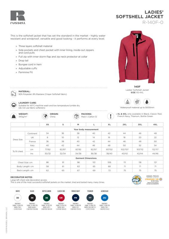 This is the softshell jacket that has set the standard in the market - highly water-resistant and windproof, versatile and good looking - it performs at every level.3 layer softshell fabric with breathable membrane and bonded microfleece lining, water resistant to 5000mmSide pockets and chest pocket with inner lining, reversed zip and cord pullsFull zip with inner storm flap and zip neck protector at collarBungee cord in hemAdjustable cuffsDrop tailFeminine fitLarge left chest side decoration accessFully launderable at 40°CWRAP certified.Accreditations: Oeko-Tex|WRAPAge Group: AdultFabric: 92% Polyester, 8% ElastaneGender: FemalePlus Size: YesProduct Type: SoftshellsSize Exclusions: *3XL and 4XL only available in these coloursSize Range: XS to 4XLSizing To Fit: XS 8 S 10 M 12 L 14 XL 16 2XL 18 3XL* 20 4XL* 22Tag: Sewn TagWashing Instructions: Suitable for 40C wash and low temperature tumble dry (do not use fabric softeners)Weight (GSM): 340gsm]]>