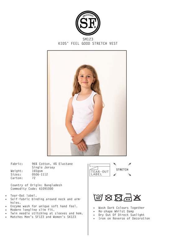 Joining the best-selling SF feel good stretch range with unique soft hand feel.Tear-Out labelSelf-fabric binding around neck and armholesEnzyme wash for unique soft hand feelModern longline slim fitTwin-needle stitching at sleeves and hemMatches men's SF123 and women's SK123SEDEX certifiedOeko-Tex certifiedBSCI certifiedVegan certified.Accreditations: Amfori BSCI|Oeko-Tex|Sedex|Peta Approved VeganAge Group: KidsFabric: 96% Cotton, 4% ElastaneGender: FemalePlus Size: NoProduct Type: VestsSize Range: 5/6 to 11/12Sizing To Fit: 5/6 24″ 7/8 26″ 9/10 28″ 11/12 30.5″Tag: Tear-outWashing Instructions: Do not bleach. Do not tumble dry. 2 dot iron. Do not dry clean. Wash at 40 degrees synthetic. Wash dark colours together. Re-shape whilst damp. Dry out of direct sunlight. Iron on reverse of decoration.Weight (GSM): 165gsm]]>