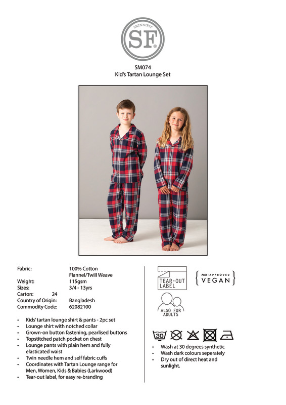 Chill out with SF's trendy loungewear, perfect for family and friends twinning. Tear-out label for easy rebranding.Woven tartan lounge set with plain hemShirt with a pyjama collar and pearlised button front, and bottoms with a full elasticated waistTear-out label.Age Group: KidsFabric: 100% Cotton flannel weaveGender: UnisexPlus Size: NoProduct Type: PyjamasSize Range: 3/4 to 13yrsSizing To Fit: 3/4 22″ 5/6 22/24″ 7/8 24″ 9/10 26″ 11/12 25/27″ 13 28″Tag: Tear-outWashing Instructions: Wash at 30 degrees synthetic. Do not tumble dry. Do not bleach. Do not dry clean. Iron on low. Wash dark colours separately. Dry out of direct heat and sunlight.Weight (GSM): 115gsm]]>