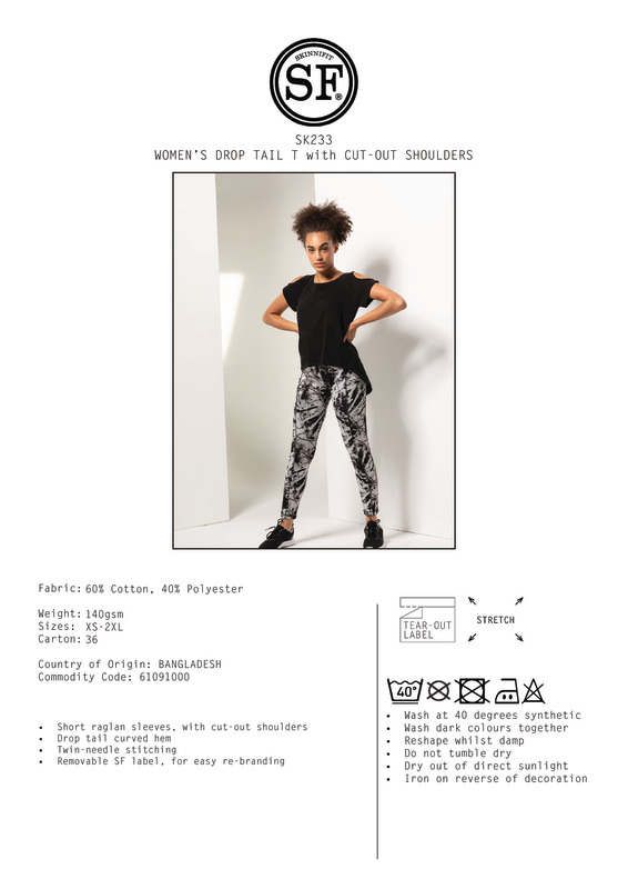 Give boring t-shirts the cold shoulder. This relaxed fit t-shirt is a cool alternative for the fashion-conscious, with short raglan sleeves, cut-out shoulders and curved drop tail hem. Tear-out label for easy rebranding.Short sleeved raglan t-shirt with drop tail and openings on shouldersTwin-needle stitching at neck, hem and sleeveRemovable Skinnifit labelSEDEX certifiedOeko-Tex certifiedBSCI certifiedVegan certified.Accreditations: Amfori BSCI|Oeko-Tex|Sedex|Peta Approved VeganAge Group: AdultFabric: 60% Cotton, 40% Polyester. Heather Grey: 85% Cotton, 15% Viscose single JerseyGender: FemalePlus Size: NoProduct Type: T-ShirtsSize Range: XS to 2XLSizing To Fit: XS 8 S 10 M 12 L 14 XL 16 2XL 18Tag: Tear-outWashing Instructions: Do not bleach. Do not tumble dry. 2 dot iron. Do not dry clean. Wash at 40 degrees synthetic. Wash dark colours together. Re-shape whilst damp. Dry out of direct sunlight. Iron on reverse of decorationWeight (GSM): 140gsm]]>