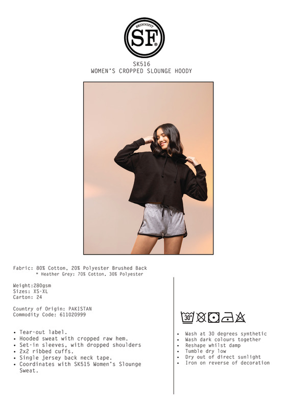 Keep it cool in this cropped slounge hoody, with its relaxed oversized shape and tear-out label for easy-rebranding.Tear-out labelOversized hoody with cropped raw hem and functioning drawcord around hoodSet-in sleeves, with dropped shouldersSingle Jersey back neck tapeVegan certifiedWRAP certified.Accreditations: WRAP|Peta Approved VeganAge Group: AdultFabric: 80% Cotton, 20% PolyesterGender: FemalePlus Size: NoProduct Type: HoodiesSize Range: XS to XLSizing To Fit: XS 30/32″ S 32/34″ M 34/36″ L 36/38″ XL 38/40″Tag: Tear-outWashing Instructions: Wash dark colours together. Re-shape whilst damp. Dry out of direct sunlight. Iron on reverse of decorationWeight (GSM): 280gsm]]>
