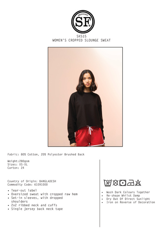 Keep it cool in this Cropped Slounge Sweat, with its relaxed oversized shape and tear-out label for easy-rebranding.Tear-out labelOversized sweat with cropped raw hemSet-in sleeves, with dropped shoulders2x2 ribbed neck and cuffsSingle Jersey back neck tapeWRAP certifiedVegan certified.Accreditations: WRAP|Peta Approved VeganAge Group: AdultFabric: 80% Cotton, 20% Polyester brushed back fleece. Heather Grey: 70% Cotton, 30% ViscoseGender: FemalePlus Size: NoProduct Type: SweatshirtsSize Range: XS to XLSizing To Fit: XS 30/32″ S 32/34″ M 34/36″ L 36/38″ XL 38/40″Tag: Tear-outWashing Instructions: Do not bleach. 1 Dot iron. Do not dry clean. Wash at 30 degrees synthetic. Wash dark colours together. Re-shape whilst damp. Tumble dry low. Dry out of direct sunlight. Iron on reverse of decorationWeight (GSM): 280gsm]]>