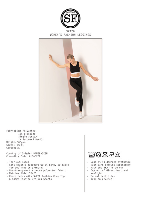 Brands and fitness fans need fashion styles that have legs. These leggings are squat-proof and feature a soft elastic band ideal for sublimation printing.Women's fashion leggingsSoft elastic jacquard waistband, suitable for sublimation printingNon-transparent stretch polyester fabricTear-out label for easy re-brandingVegan certified.Accreditations: Amfori BSCI|Peta Approved VeganAge Group: AdultFabric: 88% Polyester, 12% Elastane single Jersey. Jacquard band: 60% Nylon, 30% Polyester, 10% Elastane.Gender: FemalePlus Size: NoProduct Type: LeggingsSize Range: XS to XLSizing To Fit: XS 8 S 10 M 12 L 14 XL 16Tag: Sewn TagWashing Instructions: Wash at 30 degrees synthetic. Delicate wash at 30 degrees. Wash dark colours separately. Do not use fabric softener. Do not bleach. Do not tumble dry. Cool iron.Weight (GSM): 300gsm]]>