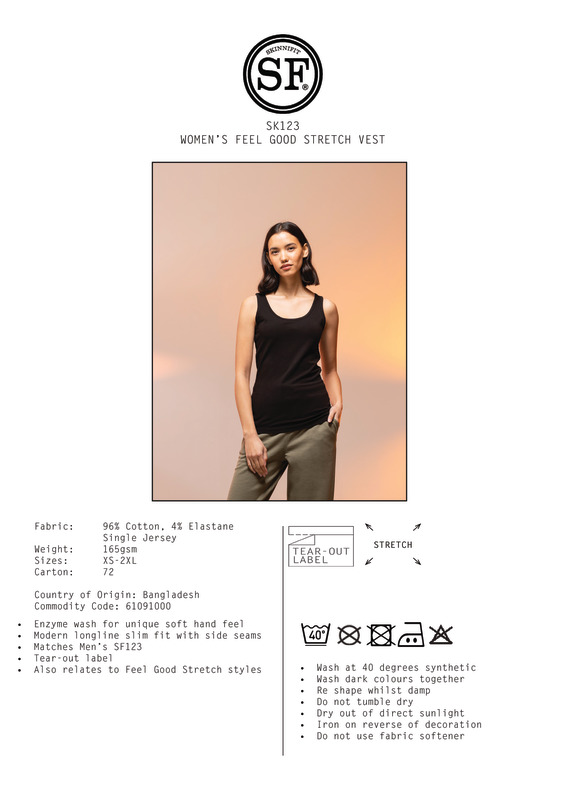 Stay cool and relaxed in this stylish stretch vest, available in core colours. Premium finish with self-fabric bound neck and armholes. Soft stretch fabric. Supreme finish. Feels good. Features tear-out label for easy rebranding. High fashion. High impact.Tear-out labelSelf-fabric binding around neck and armholesEnzyme wash for unique soft hand feelModern longline slim fitTwin-needle stitching at sleeves and hemShaped at side seamsSEDEX certifiedOeko-Tex certifiedBSCI certifiedVegan certified.Accreditations: Amfori BSCI|Oeko-Tex|Sedex|Peta Approved VeganAge Group: AdultFabric: 96% Cotton, 4% Elastane. Single Jersey, enzyme finish. Heather Grey: 81% Cotton, 15% Viscose, 4% ElastaneGender: FemalePlus Size: NoProduct Type: VestsSize Range: XS to 2XLSizing To Fit: XS 30/32″ S 32/34″ M 34/36″ L 36/38″ XL 38/40″ 2XL 40/42″Tag: Tear-outWashing Instructions: Do not bleach. Do not tumble dry. 2 dot iron. Do not dry clean. Wash at 40 degrees synthetic. Wash dark colours together. Re-shape whilst damp. Do not tumble dry. Dry out of direct sunlight iron on reverse of decoration.Weight (GSM): 165gsm]]>
