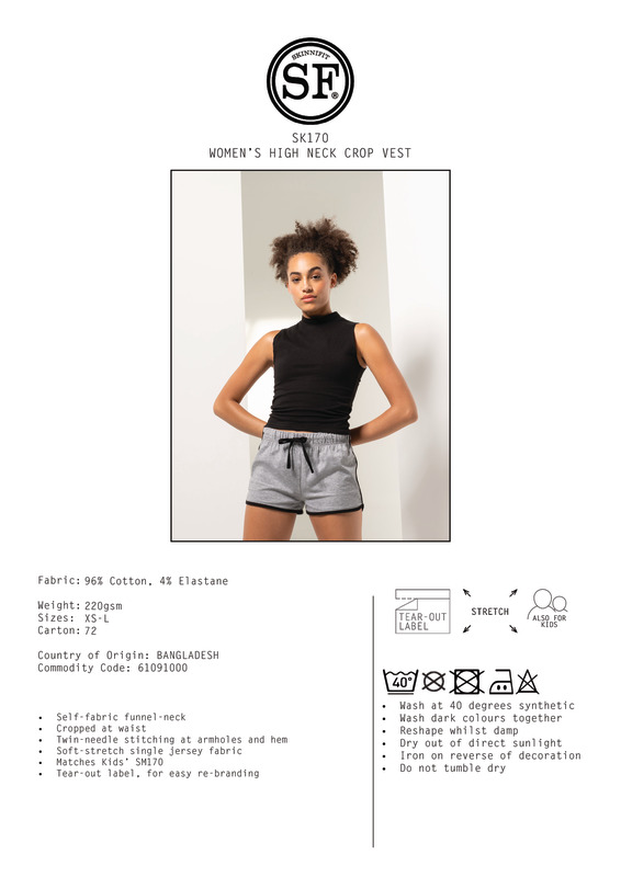 High fashion. High impact. A fashion throwback, this high neck crop vest style is in high demand again. Soft-stretch single Jersey fabric with self-fabric funnel-neck and twin-needle stitching at armholes and hem ensure a premium finish. Features tear-out label for easy rebranding.Tear-out labelSelf-fabric funnel-neckFashionable cropped lengthTwin-needle stitching at armhole and hemSoft-stretch single Jersey fabricSEDEX certifiedOeko-Tex certifiedBSCI certifiedVegan certified.Accreditations: Amfori BSCI|Oeko-Tex|Sedex|Peta Approved VeganAge Group: AdultFabric: 96% Cotton, 4% Elastane single JerseyGender: FemalePlus Size: NoProduct Type: VestsSize Range: XS to LSizing To Fit: XS 30/32″ S 32/34″ M 34/36″ L 36/38″Tag: Tear-outWashing Instructions: Do Not Bleach. Do Not Tumble Dry. 2 Dot Iron. Do not Dry Clean. Wash at 40 degrees synthetic. Wash dark colours together. Re-shape whilst damp. Dry Out of Direct Sunlight. Iron on reverse of decoration.Weight (GSM): 220gsm]]>